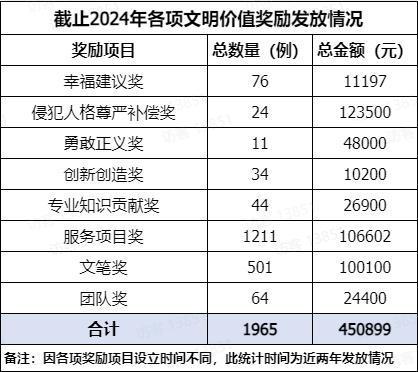 据悉,文明价值奖励包括幸福建议奖、侵犯人格尊严补偿奖、勇敢正义奖、专业知识贡献奖、服务项目奖、文笔奖、团队奖等。