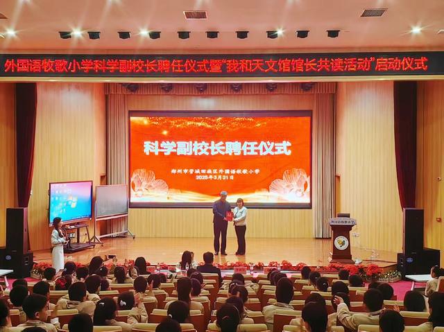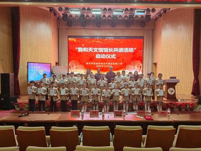 每一次仰望星空,都是人类与宇宙的对话。为了让学生们开拓视野,了解地球、太阳系、银河系乃至整个宇宙的奥秘,感受宇宙的浩瀚与神奇。 3月21日上午,郑州市管城区外国语牧歌小学举行“我和天文馆馆长共读活动”启动仪式。参加活动的有河南省妇女儿童发展中心天文馆馆长、河南财经政法大学副教授李德范,郑州科技馆魅力科学课堂兼探奇科教运营负责人张雅,特邀参与嘉宾还有外国语牧歌小学校长李志超、外国语牧歌小学映月路校区校长胡燕、外国语牧歌小学副校长及科学学科负责人刘方