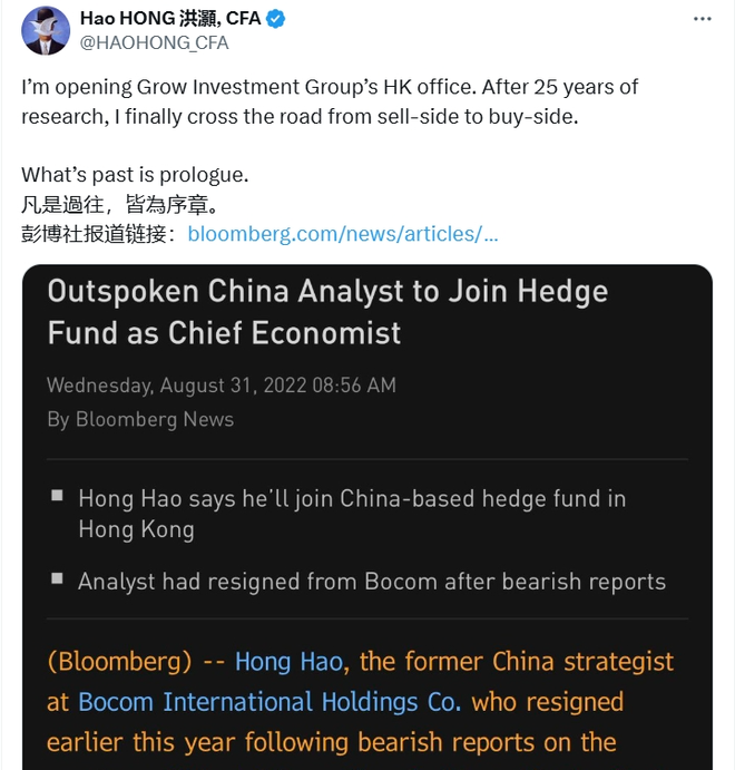外媒透露洪灏要换工作了,将去知名券商当CEO