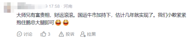 他们直呼“太棒了”,认为“何小鹏有富贵相,在国运、牛市的加持下,最终可以实现,只要紧抱小鹏的大腿就好”,并鼓励他“要加油啊”。