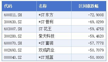 几家欢喜几家愁。近三个月,*ST东方、*ST普利、ST花王、紫天科技、*ST富润、双成药业、*ST旭蓝7只个股区间跌幅超过50%。其中,跌幅最大的是*ST东方,-72.9%。