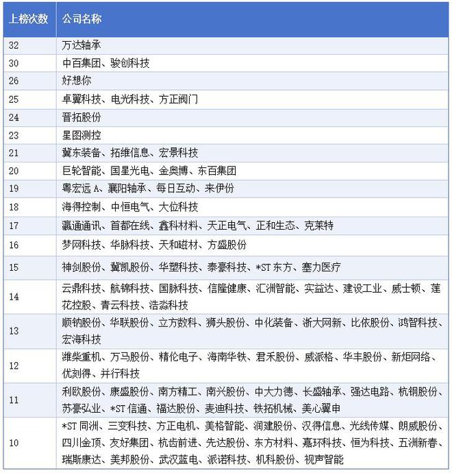 105只个股上榜次数超过10次,最高登榜32次