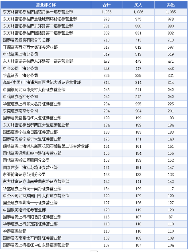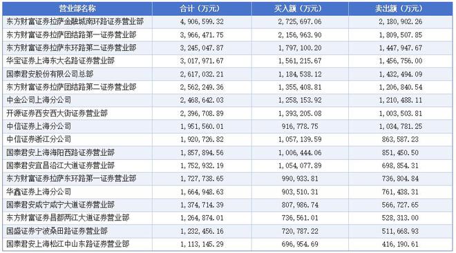从成交金额总量看,18家证券营业部超过百亿。其中,位居前十的分别是东方财富证券拉萨金融城南环路证券营业部、东方财富证券拉萨团结路第一证券营业部、东方财富证券拉萨东环路第二证券营业部、华宝证券上海东大名路证券营业部、国泰君安股份有限公司总部、东方财富证券拉萨团结路第二证券营业部、中金公司上海分公司、开源证券西安西大街证券营业部、中信证券上海分公司、中信证券浙江分公司。