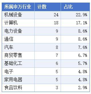 具体到上榜次数超过10次的105只个股中,分布最多的前三大领域分别是机械设备、计算机、电力设备。