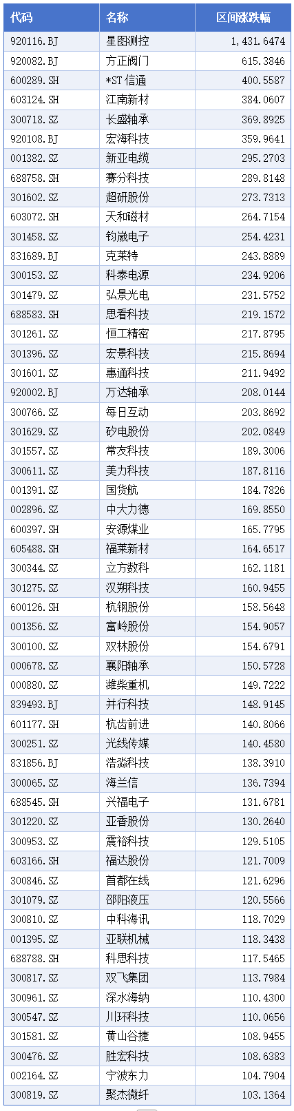从区间涨跌幅来看,近三个月,区间涨幅超过100%的有55只个股,涨幅最高的是星图测控,涨幅1431.65%;方正阀门涨幅 615.38%,位居第二;*ST信通涨幅400.56%,位居第三。