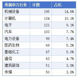根据申万行业分类,上榜的1333只个股中,分布最多的十大领域分别是机械设备、计算机、电子、汽车、电力设备、医药生物、基础化工、通信、建筑装饰、传媒。