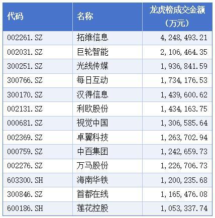 从龙虎榜成交金额看,超过百亿的有14只个股,分别是拓维信息、巨轮智能、光线传媒、每日互动、汉得信息、利欧股份、视觉中国、卓翼科技、中百集团、万马股份、海南华铁、首都在线、莲花控股。