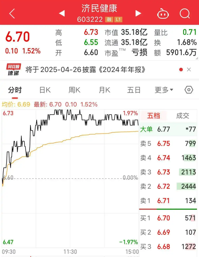 盘面上,济民健康26日股价上涨1.52%,最新股价6.7元,市值35.18亿元。