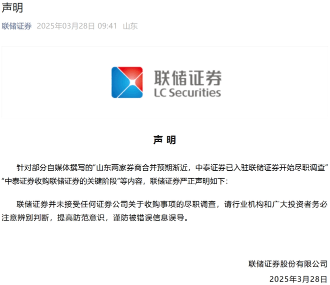 据媒体报道,早在3月25日就有市场传言称,山东两家券商合并预期渐近,中泰证券已入驻联储证券开始尽职调查。