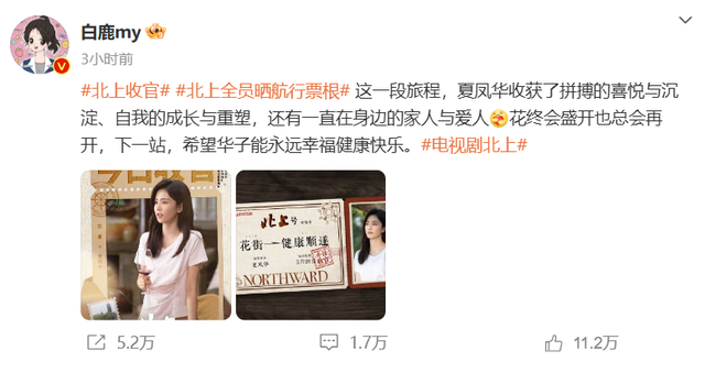 《北上》官方微博写道:美满与幸福蛰伏在生活浪潮间。兜兜转转后会发现,最珍贵的星辰,始终悬挂在团圆的屋檐之下。电视剧《北上》今晚收官。