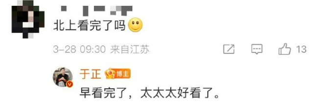 当被问到是否看完了白鹿主演的电视剧《北上》,于正秒回:“早看完了,太太太好看了。”
