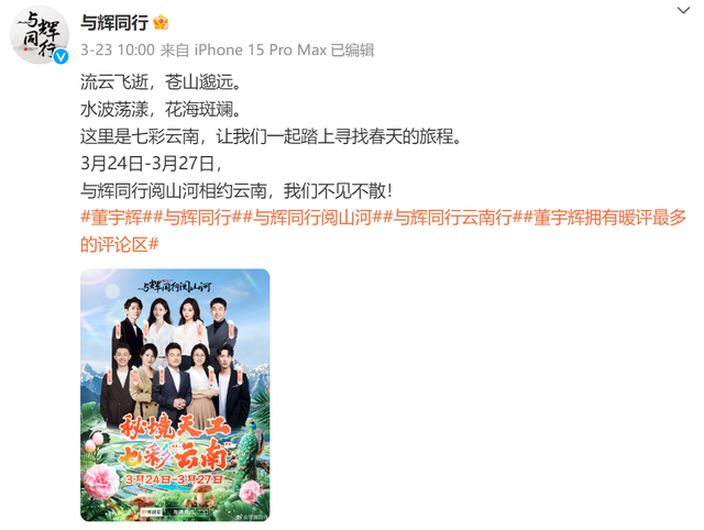 3月23日,与辉同行微博官宣“与辉同行阅山河相约云南”,开启云南行之旅。