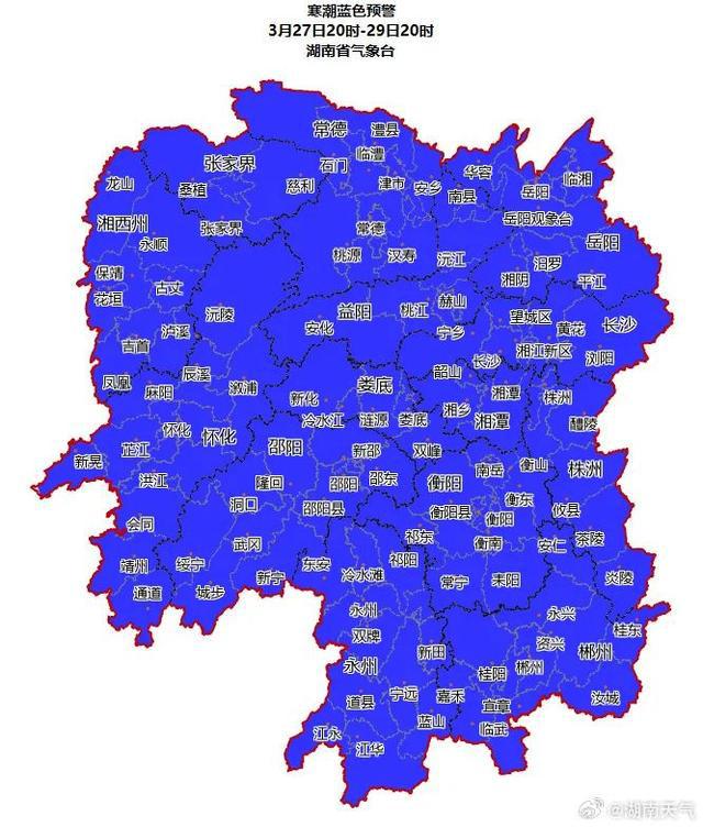 湖南省气象台3月27日16时发布寒潮蓝色预警:预计27日20时至29日20时,长沙、株洲、湘潭、衡阳、邵阳、岳阳、常德、张家界、益阳、郴州、永州、怀化、娄底、湘西州最低气温将下降8~10℃,局地12℃以上,最低气温在4~8℃,并可能伴有5级以上偏北大风,请注意防范。