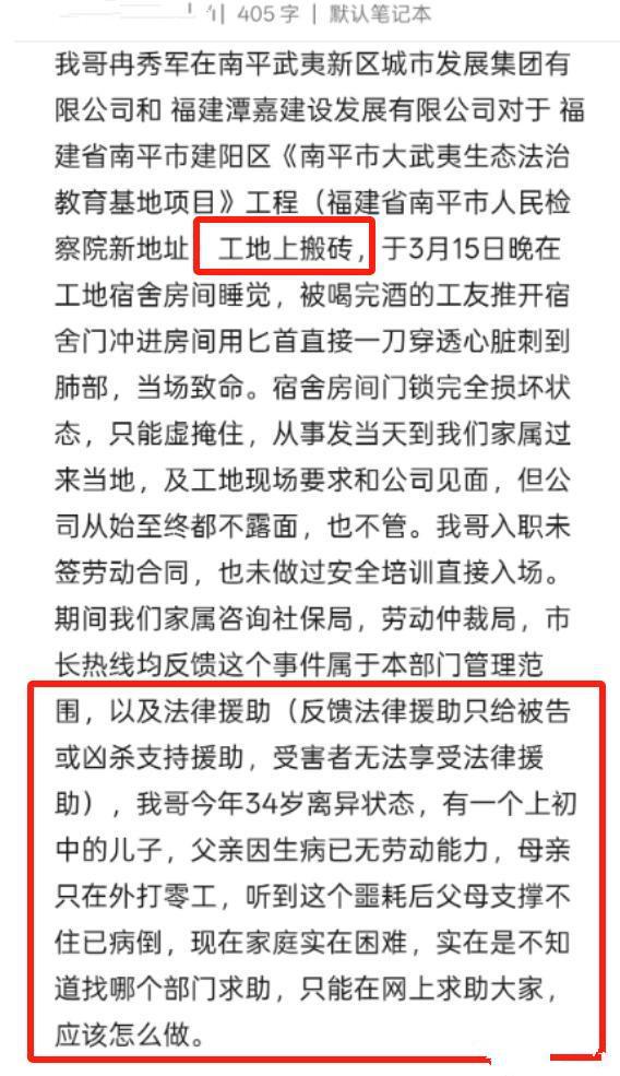 一开始,家人想着人已经被抓了,公安也在处理,等着开庭就行。可3月27号,冉秀军的妹妹冉春春在社交账号上公开了这件事,还向网友求助。原来,这工地宿舍是分包商租的,条件特别差,门锁都是坏的,根本关不上,只能虚掩着,这才给了发小可乘之机。法医鉴定通知书显示,发小那一刀捅在冉秀军左胸,心脏和肺部破裂,大出血导致死亡。而且发小行凶前喝了酒,杀完人也没跑,还在现场给他自己家人打了个电话。