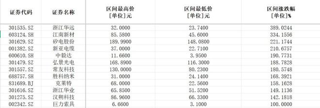 涨幅超过300%的2家上市公司分别为浙江华远、江南新材;涨幅超过200%的2家上市公司分别为矽电股份、新亚电缆;涨幅超过100%的上市公司为汉朔科技、浙江华业、胜科纳米、常友科技、弘景光电。