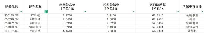 此外,根据同花顺数据,部分ST公司股价也在3月份收获了较大涨幅。其中,ST聆达、*ST信通、*ST同洲、ST柯利达、*ST迪威区间涨幅超过50%。