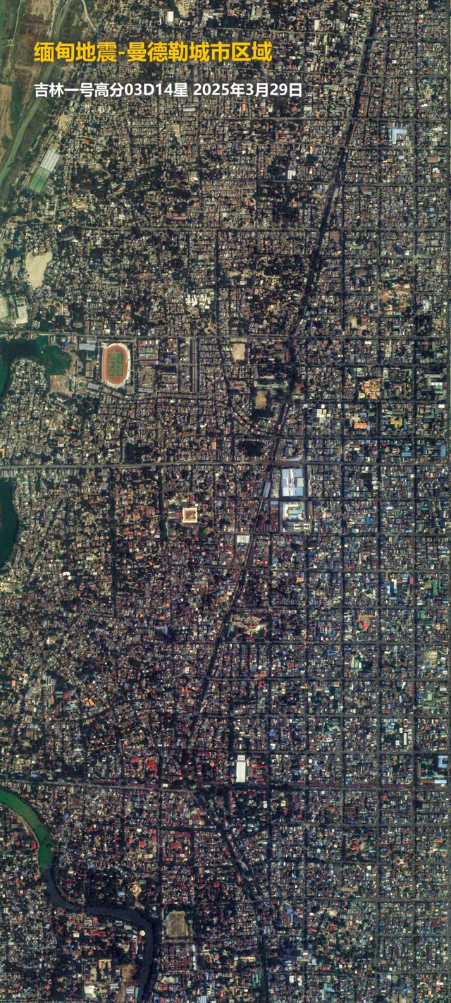 2025年3月28日,缅甸发生强震造成了重大人员伤亡和财产损失。地震发生后,吉林一号卫星迅速响应,紧急调度过境灾区,拍摄了高分辨率的现场画面,并在成像后第一时间提供给相关单位,助力抗洪救灾工作。