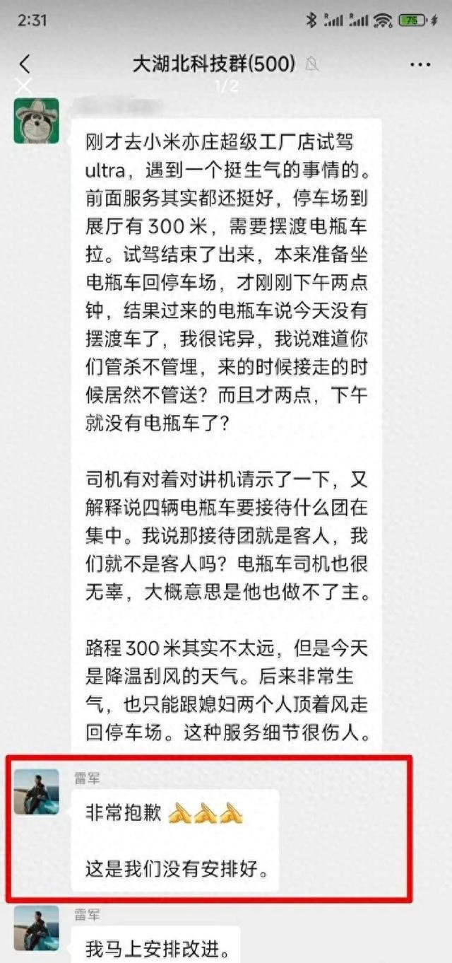 聊天截图显示,有人吐槽,“刚才去小米亦庄超级工厂店试驾ultra,遇到一个挺生气的事情。前面服务其实都还挺好,停车场到展厅有300米,需要摆渡电瓶车拉。试驾结束了出来,本来准备坐电瓶车回停车场,才刚刚下午两点钟,结果过来的电瓶车说今天没有摆渡车了”,并称“这种服务细节很伤人。”