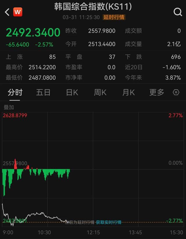 韩国综合指数一度大跌近3%,创下2月10日以来最低水平;MSCI亚太指数跌超1%。