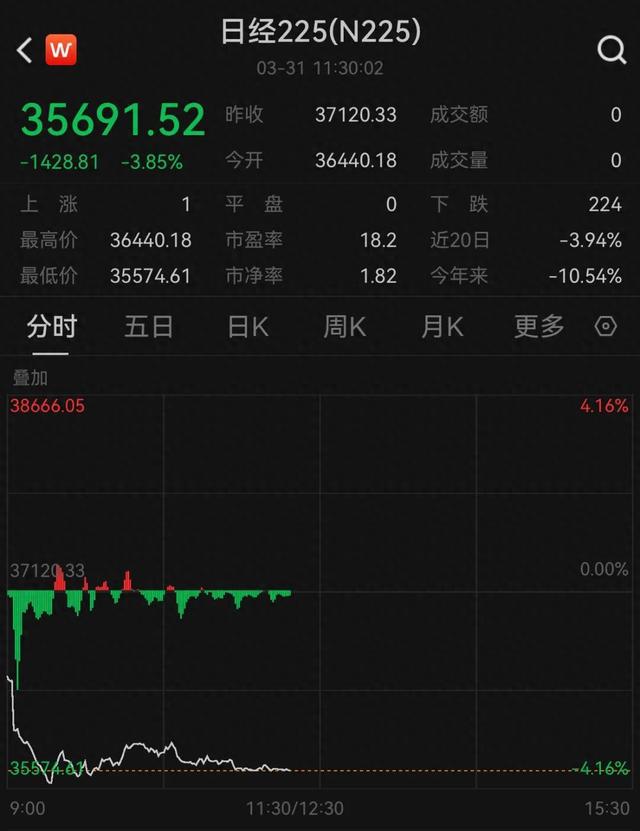 北京时间3月31日早间,日韩股市重挫,日经指数225盘初一度暴跌超1500点,盘中最大跌幅超4%;截止发稿,跌幅超3.8%。