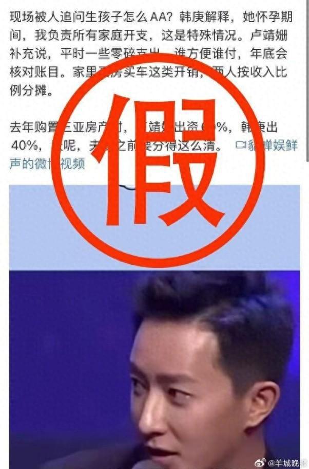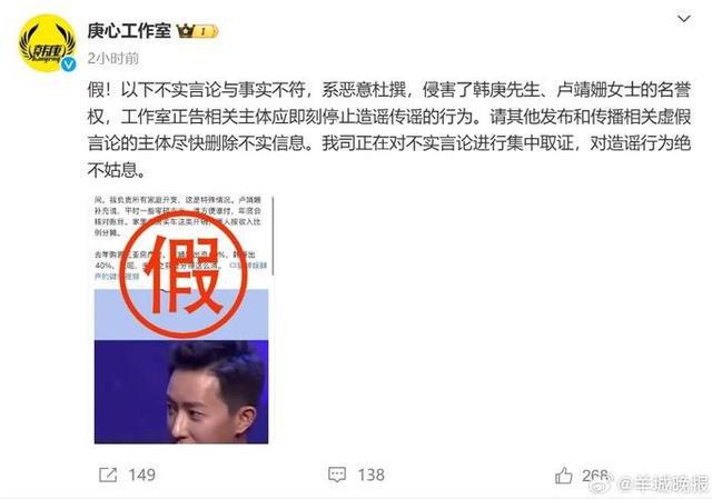 3月31日,@庚心工作室 发文否认韩庚卢靖姗夫妻“买房买车两人按收入分摊”“购置房产女方出资60%男方出40%”等传闻,其表示该言论与事实不符,系恶意杜撰,侵害了韩庚先生、卢靖姗女士的名誉权,工作室正告相关主体应即刻停止造谣传谣的行为。请其他发布和传播相关虚假言论的主体尽快删除不实信息。公司正在对不实言论进行集中取证,对造谣行为绝不姑息。