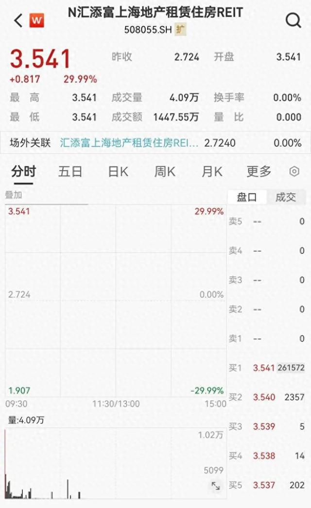 3月31日,认购总金额超1114亿元的汇添富上海地产租赁REIT上市,开盘大涨29.99%,达到了首日上市涨幅上限。