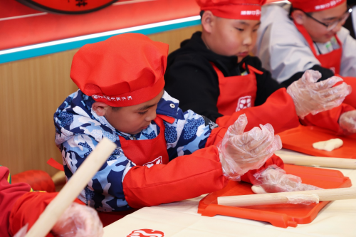 孩子们戴上厨师帽、系上小围裙,认真聆听店员讲解汉堡制作技巧。揉面、擀皮、撒芝麻……一双双小手在面团上忙碌着。童言稚语中,孩子们将传统汉堡玩出了新花样。