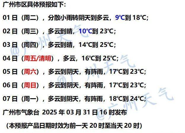 广州市气象台预计,4月1日白天起广州转阴天到多云天气,气温开始回升,昼夜温差加大。