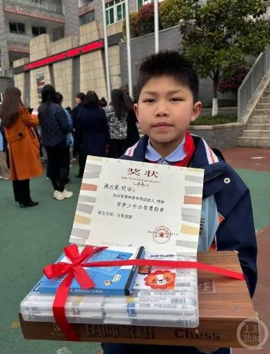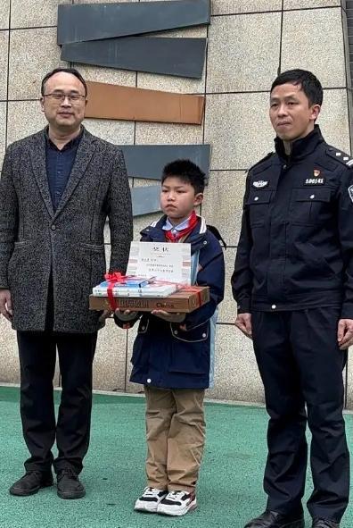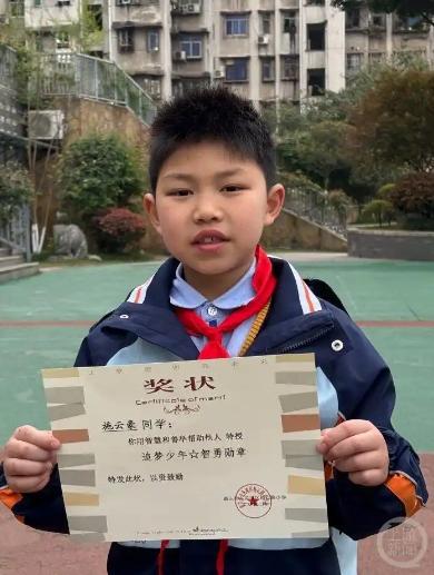 今(31)日,在杨石路小学的升旗仪式上,学校专门举行了“新时代好少年”智勇勋章表彰仪式。校长傅钰涵向全校师生讲述了他的善举,让孩子们感悟善良与担当。同时,学校党总支书记吴强为他颁发了奖状,石坪桥派出所龚警官为他送上学习用具等礼物。
