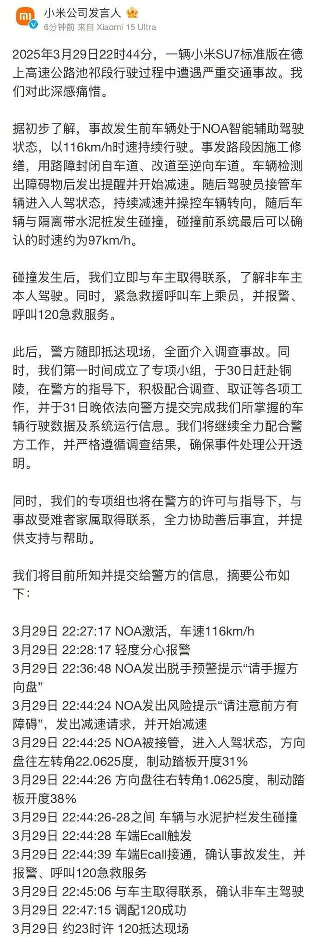 小米公司微博称,据初步了解,事故发生前车辆处于NOA智能辅助驾驶状态,以116km/h时速持续行驶。事发路段因施工修缮,用路障封闭自车道、改道至逆向车道。车辆检测出障碍物后发出提醒并开始减速。随后驾驶员接管车辆进入人驾状态,持续减速并操控车辆转向,随后车辆与隔离带水泥桩发生碰撞,碰撞前系统最后可以确认的时速约为97km/h。