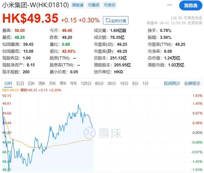 截至午间收盘,恒生指数跌2.30%,恒生科技指数跌3.78%,小米微涨0.3%,现报49.35港元/股。