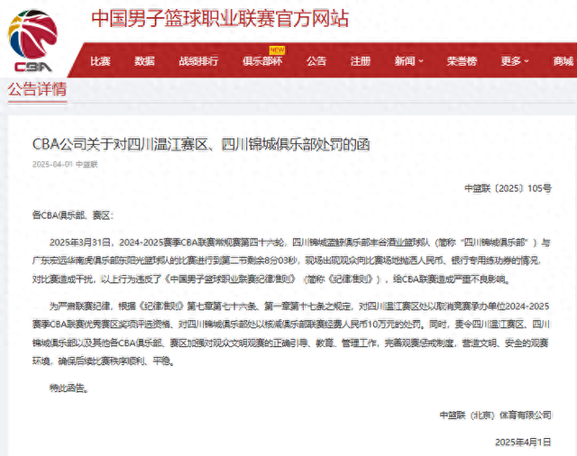 4月1日,CBA官方公布重磅罚单,核减四川队经费10万元,取消四川赛区的优秀赛区评奖资格。