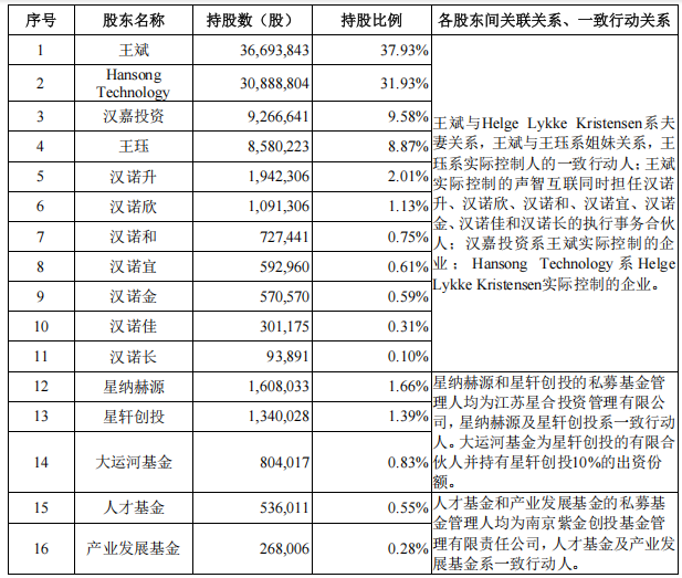 汉桑科技的实控人是王斌及其丈夫Helge Lykke Kristensen,两人合计控制公司84.93%的股份,此外王斌的妹妹王珏控制公司8.87%的股份,三人是一致行动人,合计控制公司93.8%的股份。