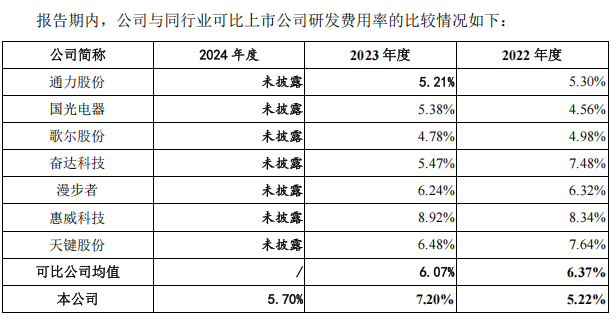 与同行业可比上市公司相比,汉桑科技无论是在研发费用率上还是已取得的专利数量上,优势都不明显。除了2023年,汉桑科技研发费用率均明显低于同行业可比上市公司。