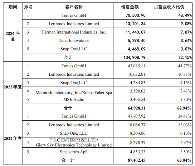另据公开信息,汉桑科技与Tonies GmbH的业务合作中仅有智能互动早教机这一款产品。也就是说,一个大客户、一款产品,贡献了公司超50%的营收。