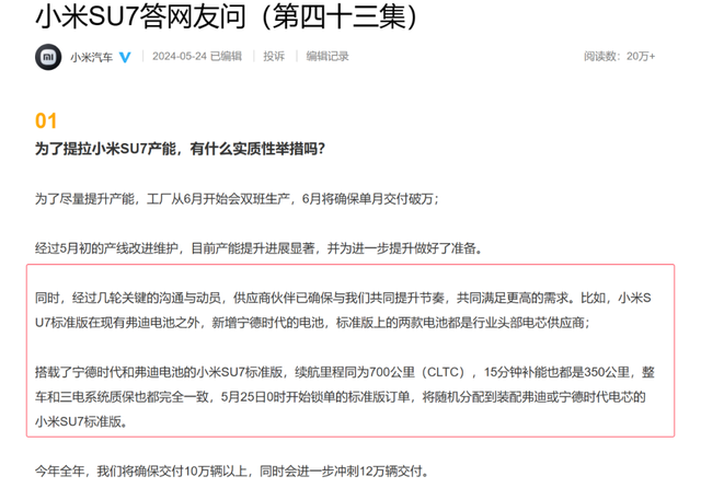 记者注意到,2024年5月,小米汽车发布的《小米SU7答网友问(第四十三集)》提到: