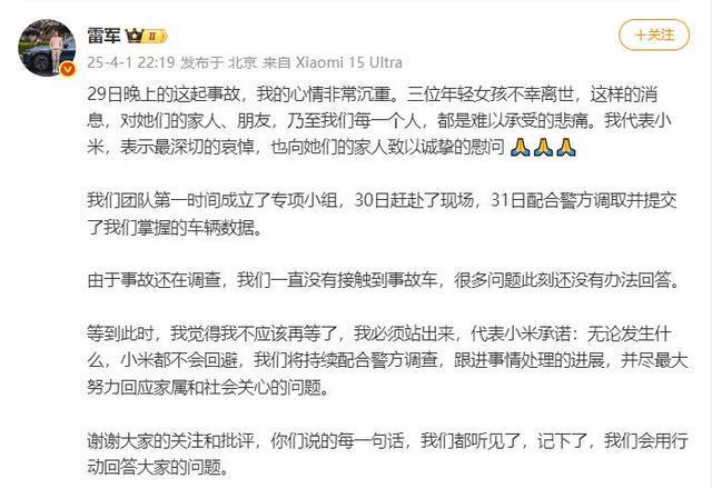 雷军表示:29日晚上的这起事故,我的心情非常沉重。三位年轻女孩不幸离世,这样的消息,对她们的家人、朋友,乃至我们每一个人,都是难以承受的悲痛。我代表小米,表示最深切的哀悼,也向她们的家人致以诚挚的慰问。我们团队第一时间成立了专项小组,30日赶赴了现场,31日配合警方调取并提交了我们掌握的车辆数据。由于事故还在调查,我们一直没有接触到事故车,很多问题此刻还没有办法回答。