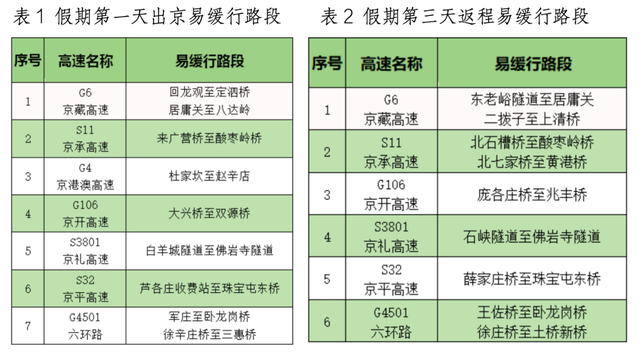 高速公路交通量较平日增幅明显,峰值预计出现在假期第一天,上午8时至11时高速公路出京方向交通量大,京藏、京承、京港澳、京开、京礼、京平、六环路等高速部分路段可能会出现通行缓慢情况。