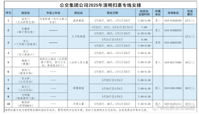 此外,已开通由市区直达太子峪陵园、通惠陵园、温泉墓园、天慈公墓、八达岭人民公墓等5个陵园墓地的10条扫墓专线,并配备充足运力。为方便市民前往八宝山人民公墓地区进行祭扫活动,5个祭扫接待高峰日每日7时至11时30分,1路公交(老山公交场站至四惠枢纽站)在上庄大街临时增加地铁八宝山站。