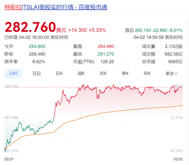 4月2日开盘,特斯拉跳空低开,一度跌超6%,随后一路回升,收盘涨超5%。
