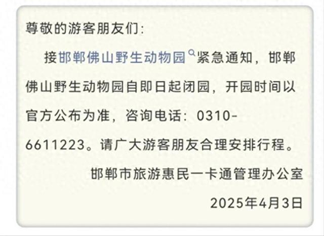邯郸市旅游惠民一卡通管理办公室于当日中午12时许发布消息称,接邯郸佛山野生动物园紧急通知,邯郸佛山野生动物园自即日起闭园,开园时间以官方公布为准,并公布了咨询电话。该咨询号码与动物园的公开电话相同,九派新闻多次致电,提示关机。