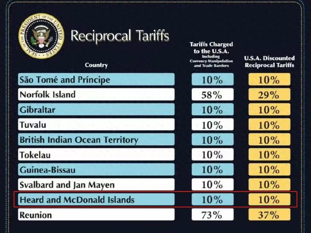 澳大利亚海外领地赫德岛和麦克唐纳群岛(Heard and McDonald Islands)也在加征关税的名单中