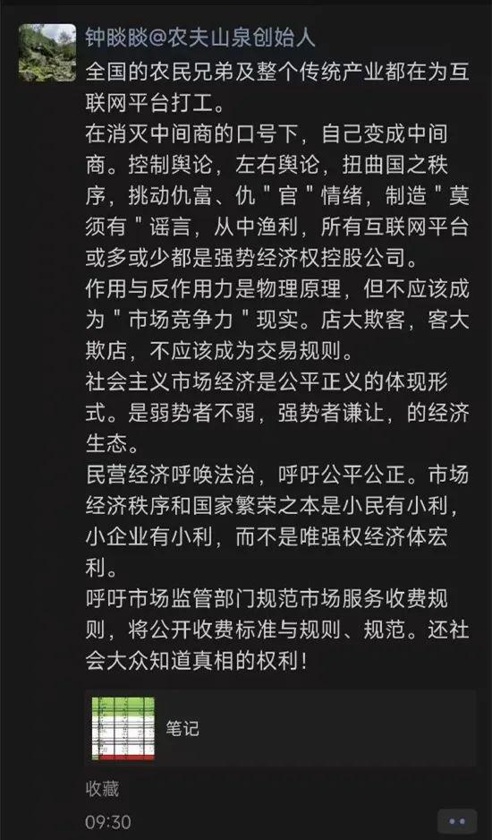 近日,农夫山泉创始人钟睒睒在朋友圈发文称,全国的农民兄弟及整个传统产业都在为互联网平台打工。