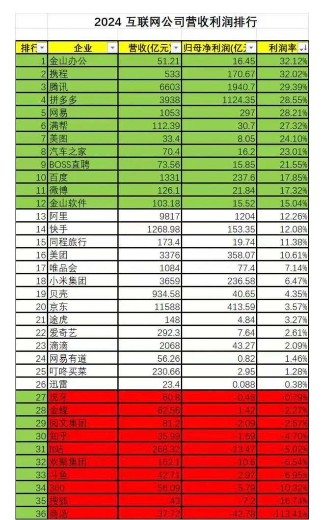 这则发文还附有一张关于2024年互联网公司营收利润排行的表格,囊括金山办公、贝壳、商汤等企业,其利润率从32.12%至-113.41%不等。