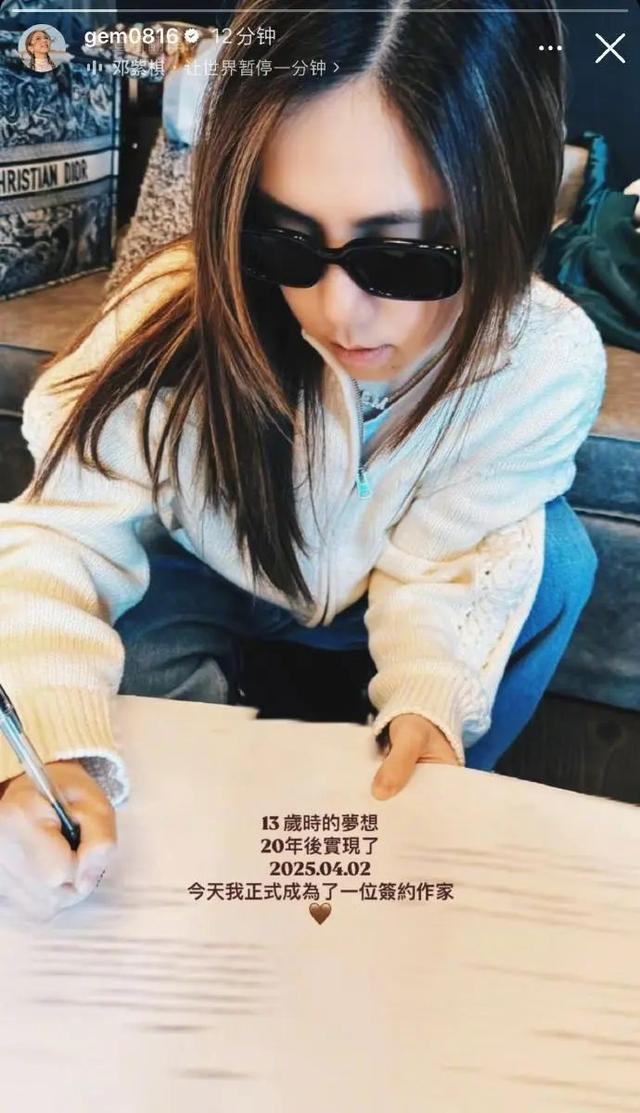 近日,邓紫棋更新社交媒体动态称:13岁时的梦想20年后实现了,2025.04.02,今天我正式成为一位签约作家。