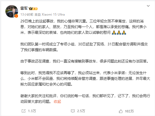雷军造车,三年磨一剑,小米SU7上市即爆红,交付超10万台,刷新了造车新势力的纪录。智驾是他吹响的号角,也是他肩上的重担。事故发生后,小米迅速回应:成立专组,配合调查,承诺还原真相。这份态度值得肯定。然而,部分网友的愤怒并未消散,这种心情可以理解——毕竟,生命的逝去是无法弥补的伤痛。