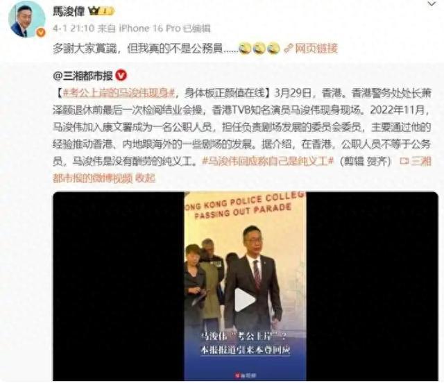 4月1日,马浚伟发出2年前的采访报道澄清:“多谢大家赏识,但我真的不是公务员。”