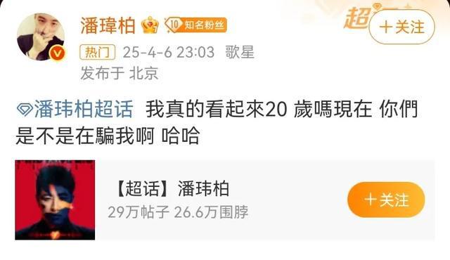 对于粉丝的夸赞,潘玮柏回应:我真的看起来20岁吗现在?你们是不是在骗我?
