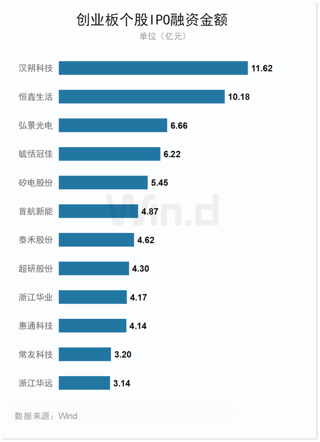 其中,汉朔科技以11.62亿元领先,恒鑫生活、弘景光电、毓恬冠佳、矽电股份4家融资规模均在5亿元以上。