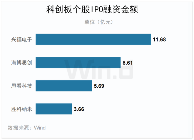 其中,兴福电子以IPO融资11.68亿元居首,海博思创、思看科技和胜科纳米融资分别为8.61亿元、5.69亿元和3.66亿元。